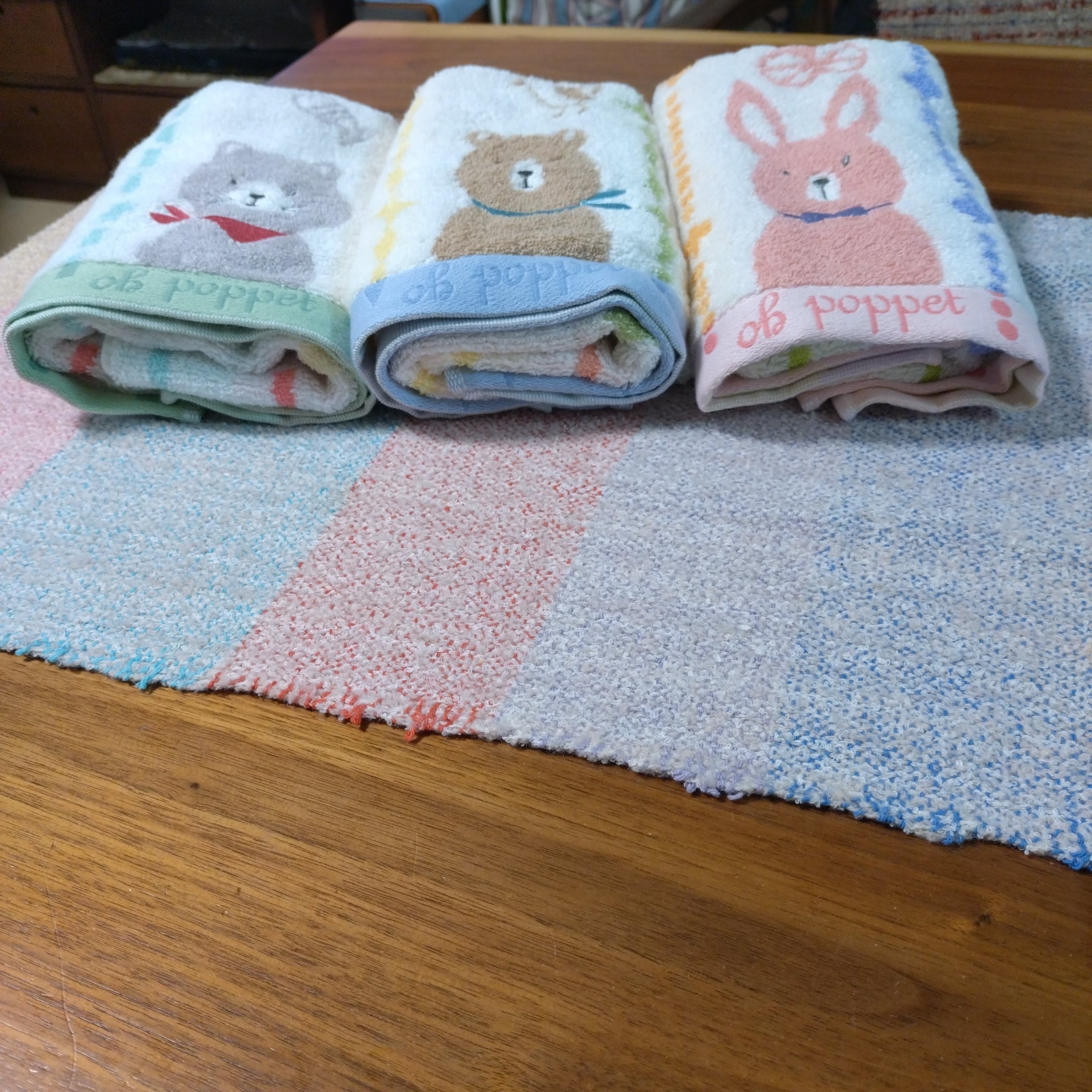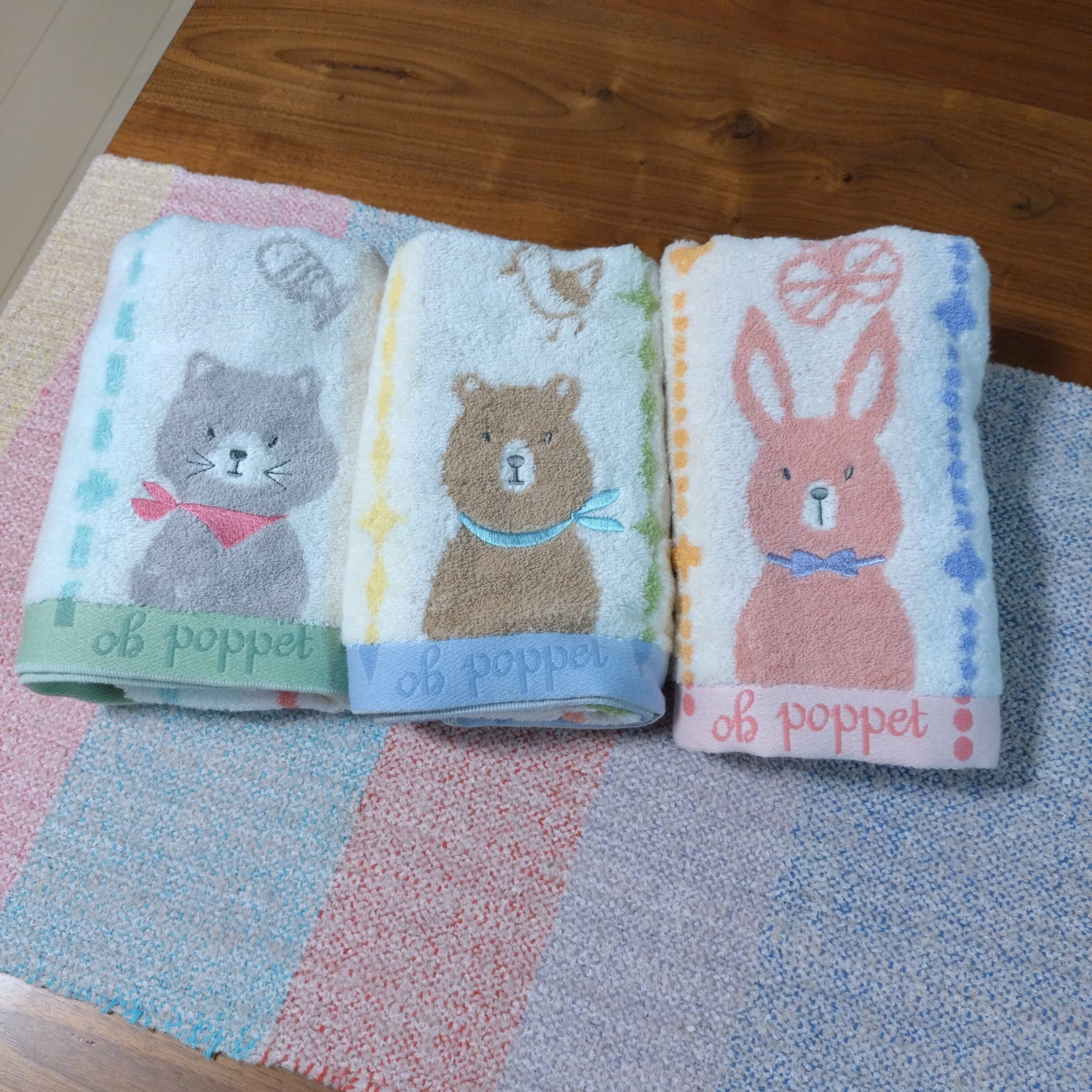 ふわふわとした手触りが特徴の「ポペット2」今治タオルは、かわいいウサギ、クマ、ネコのデザインで、キュートさ満点です!コットン100%のやさしい素材で、肌に触れるたびに幸せな気持ちになれるタオルです。