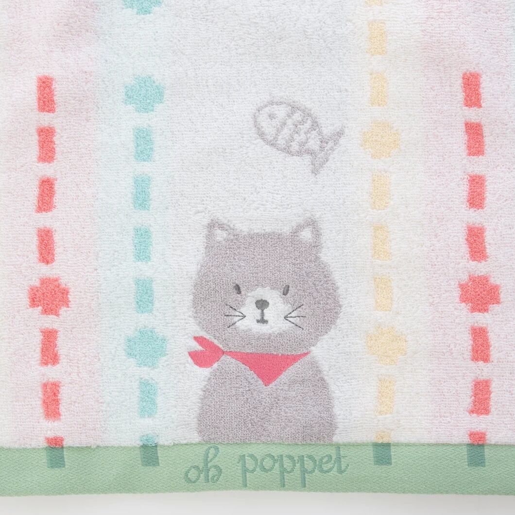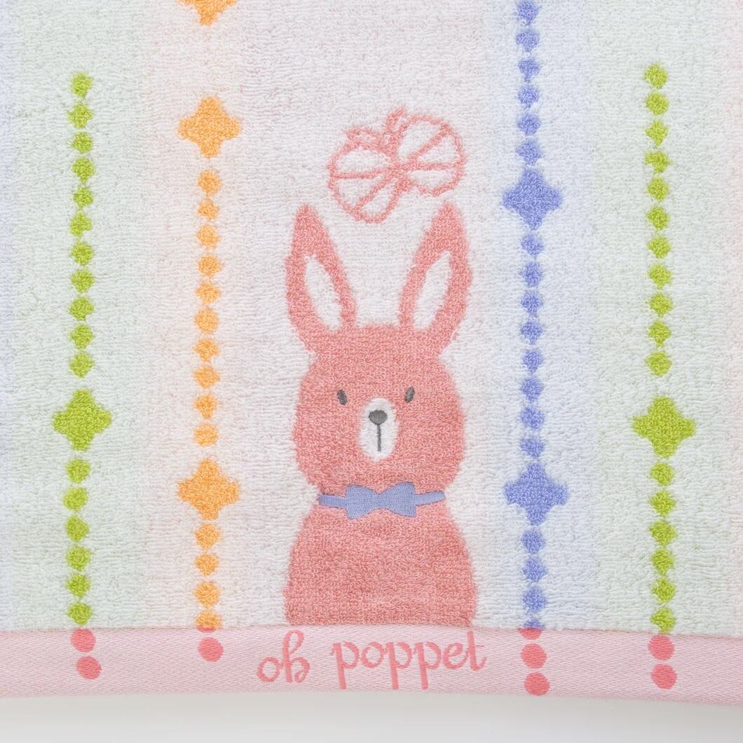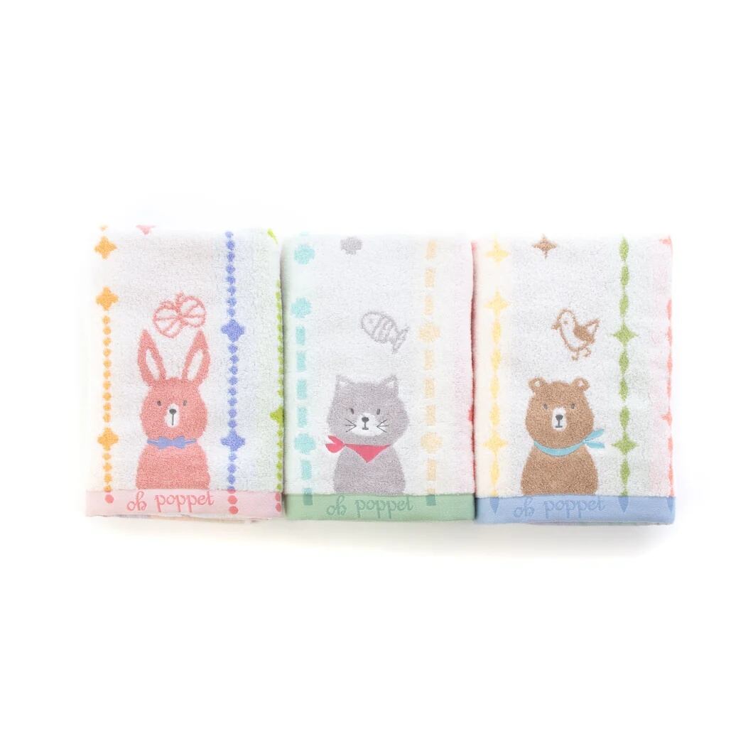 ふわふわとした手触りが特徴の「ポペット2」今治タオルは、かわいいウサギ、クマ、ネコのデザインで、キュートさ満点です!コットン100%のやさしい素材で、肌に触れるたびに幸せな気持ちになれるタオルです。