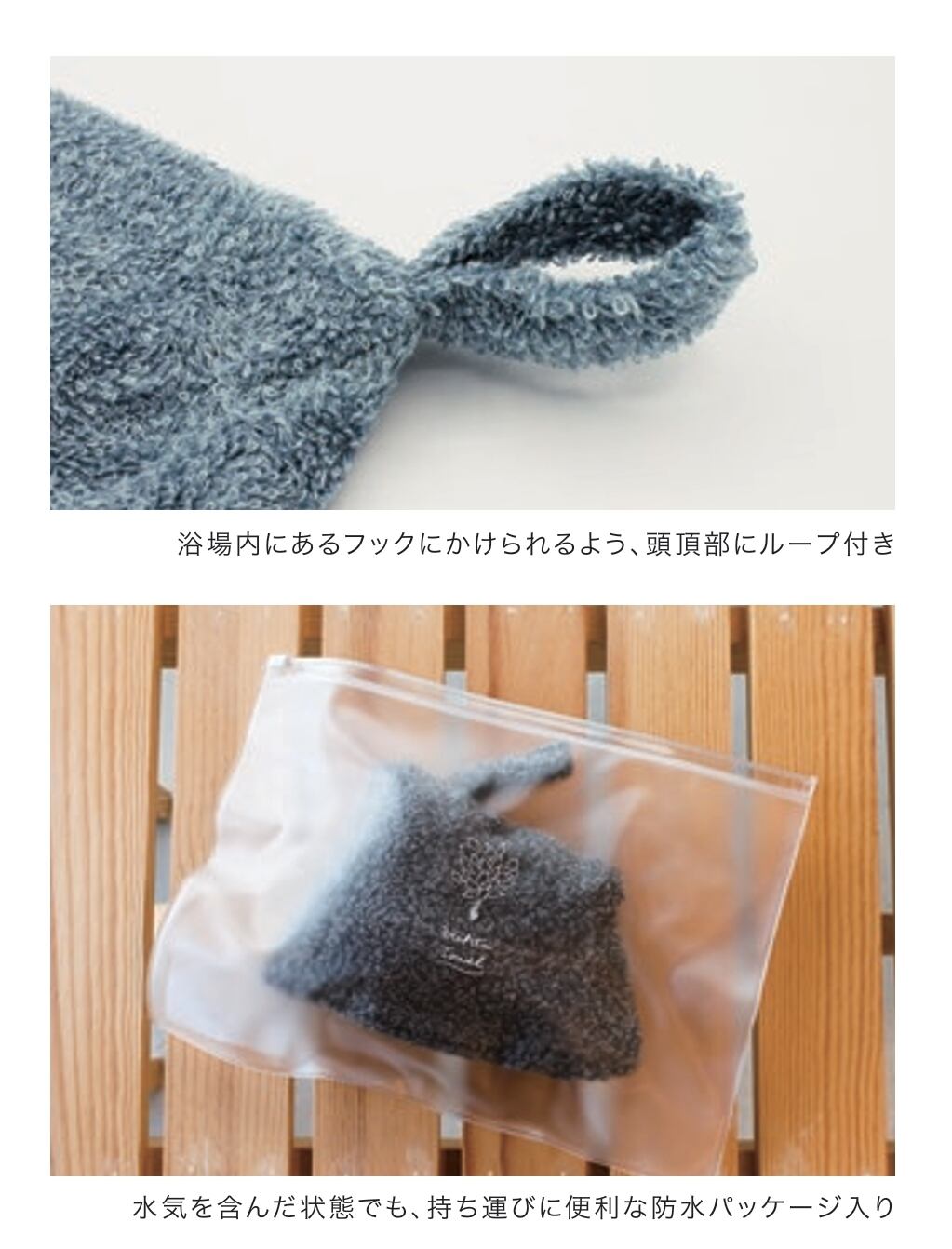 浴場内にあるフックにかけられるよう、頭頂部にループ付き